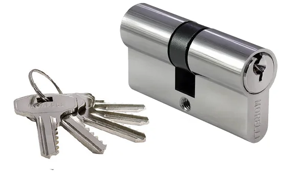 Ключевой цилиндр с заверткой для двери вставляется в замок или защелку для закрытия ключом с одной стороны помещения и поворота кноба с другой.